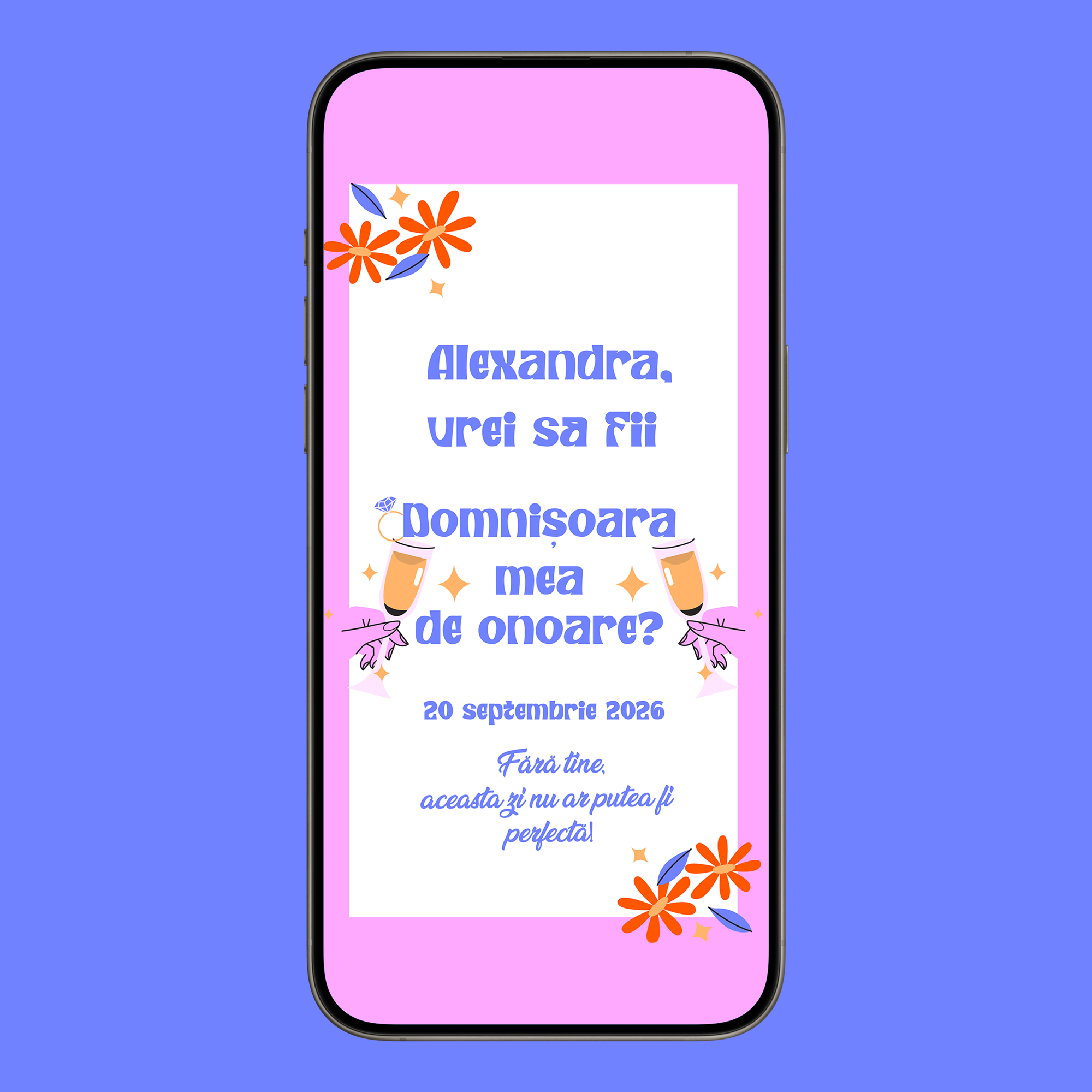 Invitația domnișoară de onoare e ușor de completat și transmis mai departe. Prietenele de suflet merită ca un astfel de anunț să fie făcut cât mai special.